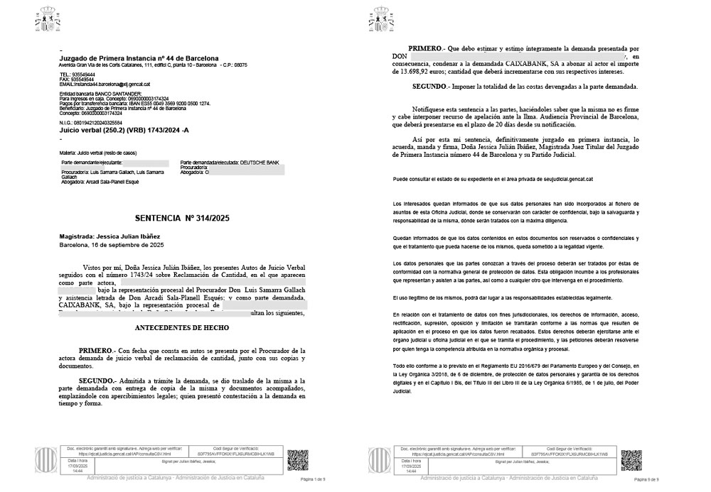 Sentencia dictada por el Juzgado de 1a Instancia nº 44 de Barcelona, de fecha 16 de septiembre de 2025, CaixaBank condenada por fraude bancario. Sentencia lograda por la actuación del abogado Arcadi Sala-Planell Esqué, socio de BBS Abogados, confirma la tendencia de los tribunales a condenar a las entidades bancarias.